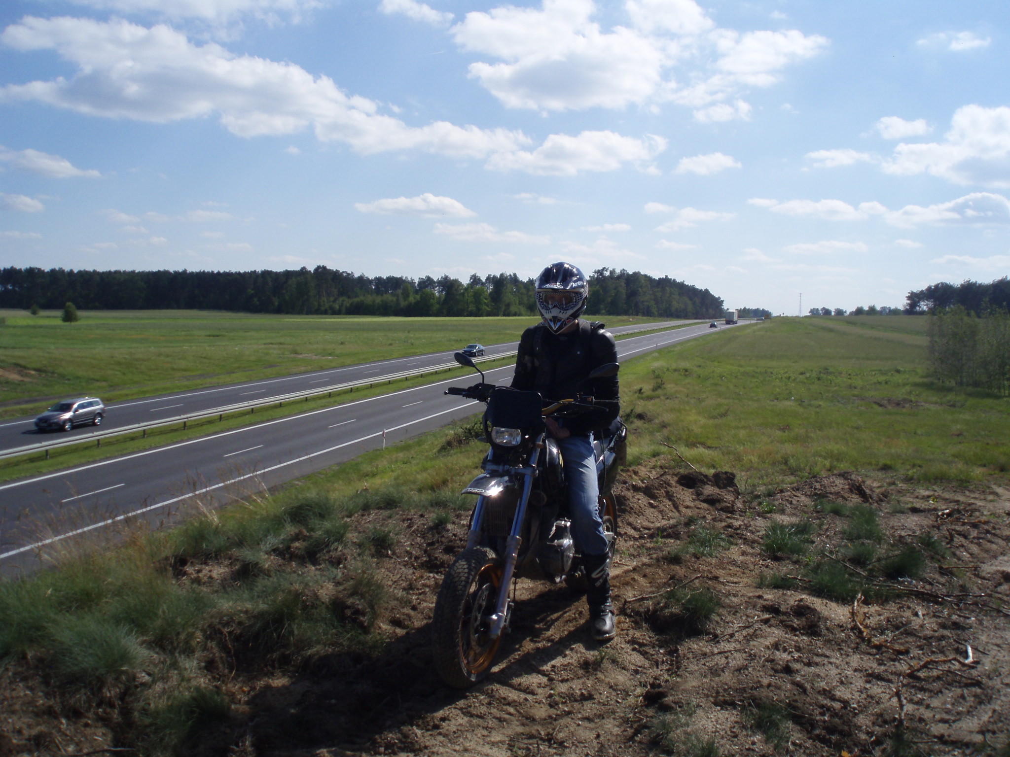 Ja dzisiaj w Motor Mani przeczytałem artykuł o Hondzie HM 450 w supermoto i sie zakochałem 103 kg 56 koników moja Dr ze swoimi 45 km i 147 kg to gruba baba , na asfalcie tego nie czuć , ale po ostaniej wyprawie do Sulejowa z kolegą na Ktm exc 125 byłem wymęczony bo jechalismy tylko bocznymi , lasami polami . Piach i błoto na kołach supermoto z oponami heidenau to masakra lezałem milion razy. W piachu prowadzało mnie haha od lewej do prawej jedyne co pomagało to podnózki, łycha i zaciśniete zeby , a na błocie mogłem sobie zaciskać zęby nawet zwieracze, nic to nie dawało tył wyprzedzał mnie co chwila :D