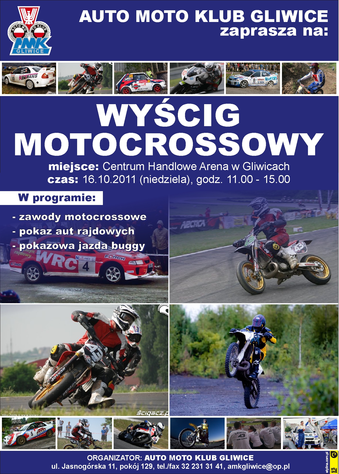 AUTO MOTO KLUB GLIWICE ma zaszczyt zaprosić na WYŚCIG MOTOCROSSOWY, który odbędzie się w najbliższą niedzielę od godz.11:00 przy CH ARENA w Gliwicach.