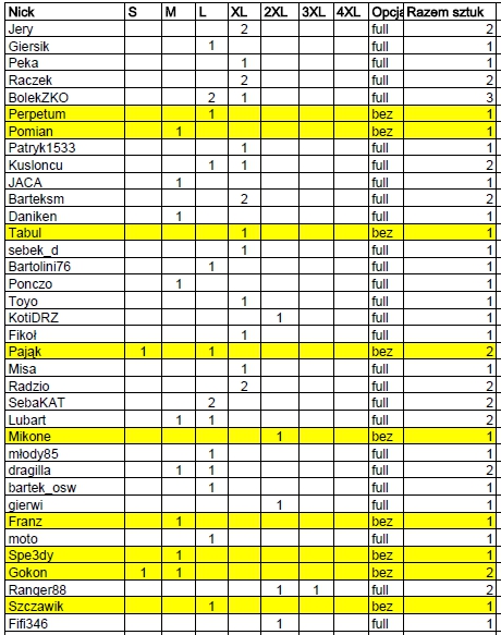 Dla unikniecia pomyłek bardzo proszę , zeby każdy zamawiający bluze sprawdził w tabeli czy zgadza sie jego zamównienie . Wydaje mi sie , że wszystko jest zrozumiałe , ale na wszelki wypadek wyjaśnie. W rubryce z rozmiarami liczba oznacza ilość sztuk z konkretnego rozmiaru , opcja - wszystkie nadruki(full) , wersja bez loga S (bez) i łączna ilość sztuk zamówionych przez chętnego .